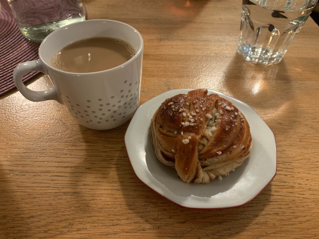 On a happy note, I’ve mentioned in a previous post about how Swedes LOVE their fika. Even though I was never a coffee drinker before coming here, I have really started to partake and enjoy in this cultural phenomenon. Something that I did yesterday was combining fika with one of my favorite things on this planet: cats! I went to a cat cafe and just spent the lunch hour playing with cats while having some kaffe och kanelbullar (coffee with a type of Swedish cinnamon roll). Here is what a typical fika looks like (sans cats):